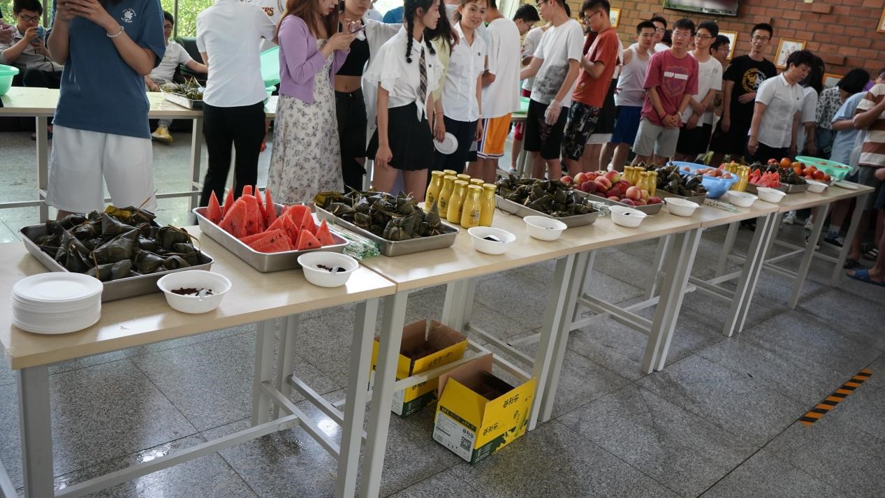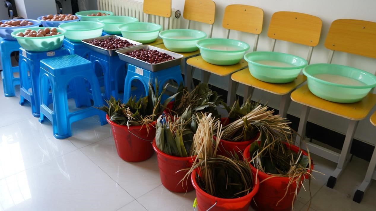 在信息学院、后勤集团、龙源物业的精密部署和齐心努力下,活动开始前一天场地已经布置完毕,所有食材全部准备就绪。龙源物业为同学们提供了粽叶、糯米、大枣、煮鸡蛋等各类端午民俗物品,并提前准备了煮好的粽子和水果、果汁供大家品尝。