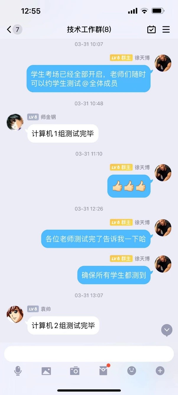 2022年研究生复试教师校外分散对复试系统操作是一大挑战,需要在复试过程中充分考虑可能出现的系统瘫痪、重建考场、应急系统搭建等问题。为了应对突发情况,学院安排徐天博、王守金老师参与技术秘书培训、系统搭建、应急预案设计等工作。老师们在时间紧、任务急的情况下,连续熬夜进行复试系统组织方案设计、测试等工作。由年轻教师们组成的技术秘书团队面对考生测试量大、考生测试时间不确定的情况,加班加点组织考生进行测试,为研究生复试系统操作提供了坚实的技术支持。