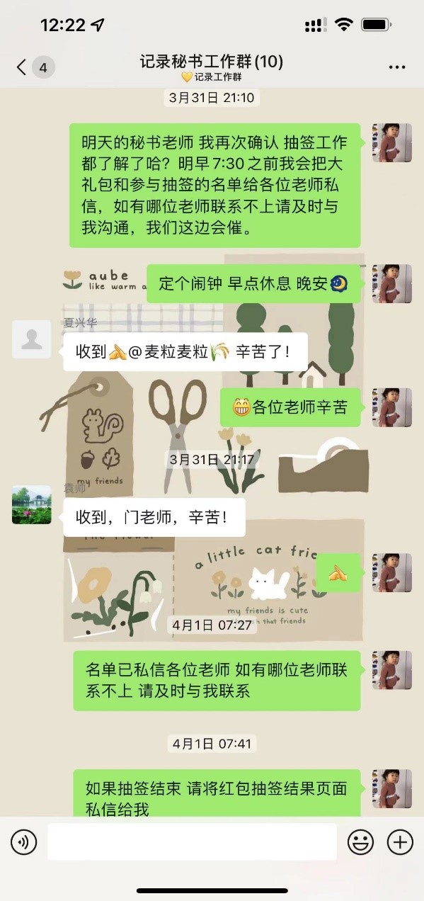 考生组织、记录秘书培训、核算分数、调剂考生确认等环节是保证研究生复试工作节奏有序的关键环节。复试期间,学院研究生教学秘书门蕊老师正值休产假。得知学院研究生招生工作人员紧缺,门蕊主动要求提前返岗并承担相关工作。在每次秘书组会中,除了听到门老师的组织安排,更多的是听到门老师那边传来的婴儿咿咿呀呀的哭声。门老师不仅有担当,而且有办法。为了保证第一时间通知考生录取信息,每个批次复试后都熬夜核算复试成绩并与研究生院配合完成考生确认工作;因为疫情不能线下抽签,门老师设计了复试教师红包抽签规则,简便、有趣且公正,为研究生复试管理工作提供了切实的秩序保障。