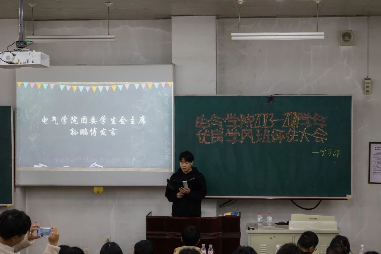 会议伊始,主持人宣布大会开始并介绍到场各位嘉宾。随后,由安稳老师登台致辞,深刻阐述了学风建设对于电气学院发展的重要引领作用,表达对此次活动带来的学风影响的期待。接着,团委学生会副主席桂旭宣读评分细则及参赛各班基础材料评分。接下来活动正式开始,由2022级、2023级各班代表依次进行答辩。他们从班级活动、学风建设、班级成绩、学科竞赛等方面讲述着班级蓬勃向上的发展历程,以及班级同学们在学习中的努力奋斗、共同进步,在生活上的互帮互助、友爱团结。此次优良学风班评选大会精彩绝伦的答辩,体现着各班级优秀学风建设的方方面面。随着一段舒缓的音乐结束,团委学生副书记李晓明宣读各班评分及获奖情况。最后,团委学生会主席孙鹏博对此次活动进行总结发言,希望各班级保持优势、弥补不足,明确班级建设目标并向其砥砺发展。