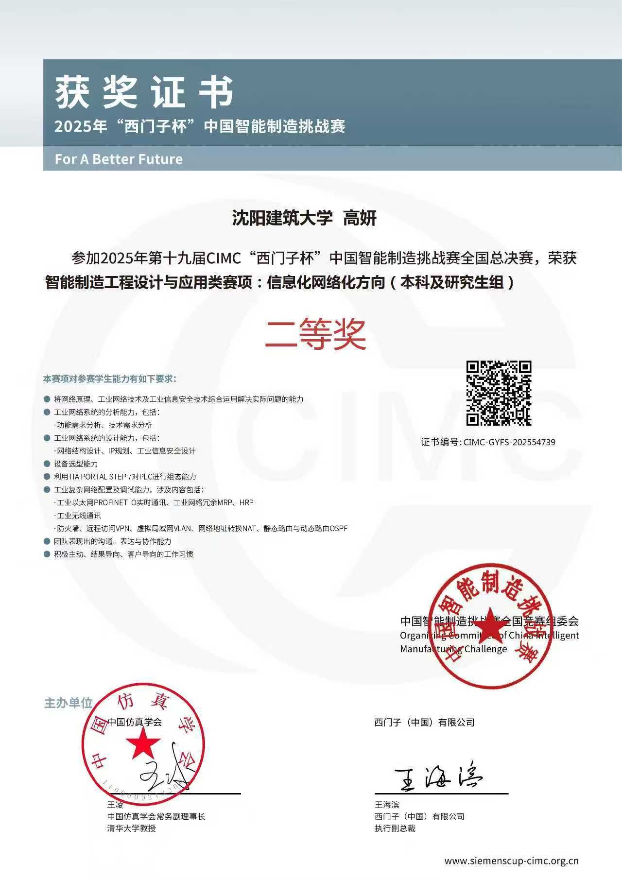 近日,2025年第十九届“西门子杯”中国智能制造挑战赛(CIMC)全国总决赛在太原理工大学落下帷幕。我院通信工程23级高妍、郑梦婷两名同学经过初赛激烈的角逐,在智能制造工程设计与应用类赛项:信息化网络化方向初赛中获省特等奖,顺利进入全国总决赛,并在总决赛中获国家二等奖。