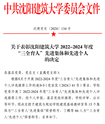 2024年12月2日,中共沈阳建筑大学委员会公布关于表彰沈阳建筑大学 2022-2024 年度 “三全育人”先进集体和先进个人的决定,WilliamHill中文通信工程教研室获“三全育人”先进集体,王瑾、谷嫔嫔、张卿云、屈秋霞获“三全育人”先进个人荣誉称号。